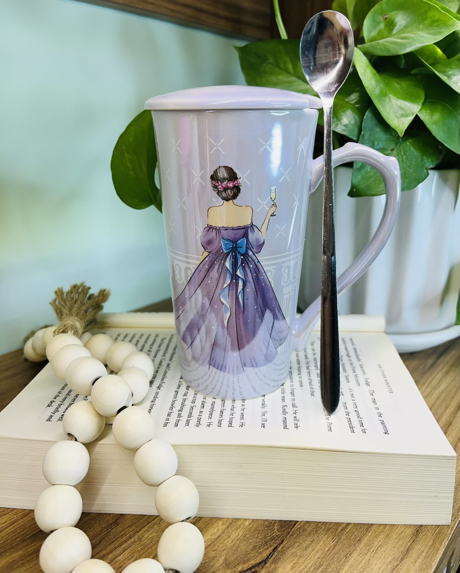 ماگ بلند استوانه درب دار پرنسسی سرامیکی قاشق دار
